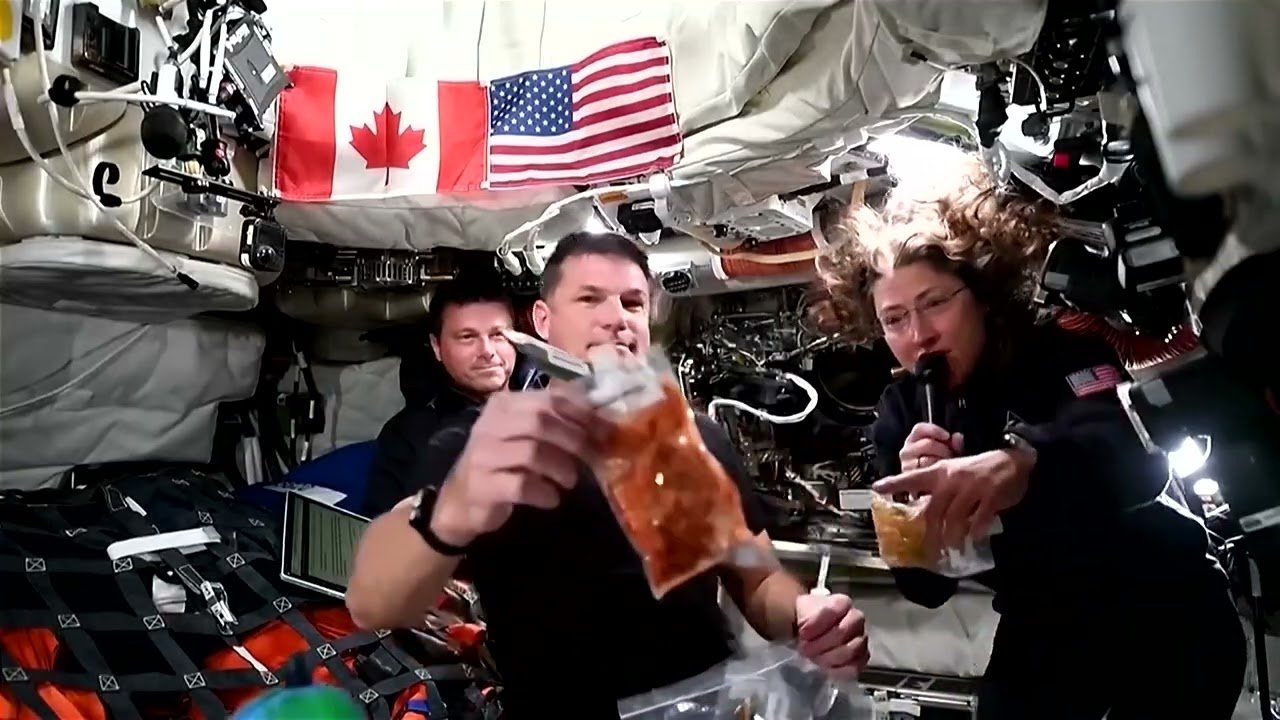 „მე სულ რამდენიმე დღეა, რაც კოსმოსურ საკვებს ვჭამ. მაგრამ კრისტინა თითქმის ერთი წელი ცხოვრობდა კოსმოსში. ის ძალიან ბევრ კოსმოსურ საკვებს ჭამდა. აქ რამდენიმე რამ გვაქვს რომ გაჩვენოთ. ეს ჩემი ვახშამია, ეს ჯერის ვახშამია… კოსმოსში, ძირითადად საკვებს სხვადასხვა ტიპის პაკეტიდან ვჭამთ – პლასტმასას ან პატარა მეტალის პაკეტებიდან. რადგან ჩვენი საკვების დიდი ნაწილის ხელახლა უნდა გავაზავოთ (წყალი დავუმატოთ). ეს კრევეტის კოქტეილია და უკვე განზავებულია, ანუ მას წყალი დავუმატეთ. კრევეტები იწოვენ წყალს და სინამდვილეში, საკმაოდ გემრიელია. აი ეს არის მაგალითი საკვების, რომელიც ჯერ არ არის განზავებული. კოსმოსში გამოსაგზავნად ის მთლიანად გამოშრეს. ეს მწვანე ლობიოა, ასე რომ, ბოსტნეულის ჭამა კოსმოსშიც კი გვიწევს. მაგრამ არ ინერვიულოთ, მაკენ’ჩიზსაც გვაჭმევენ”,- ამბობენ ასტრონავტები.
